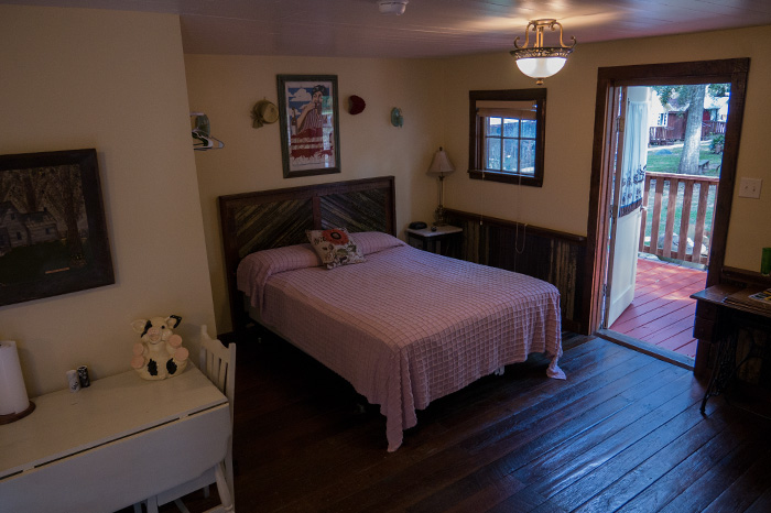 Bright and cheerful, 2 bedroom cabin queen, double and 2 twin beds. 50’s decorations and 50’s lamps. Private bath with tub/shower. Glass porch complete with mini kitchen and microwave. Front porch with view of all the cabins.